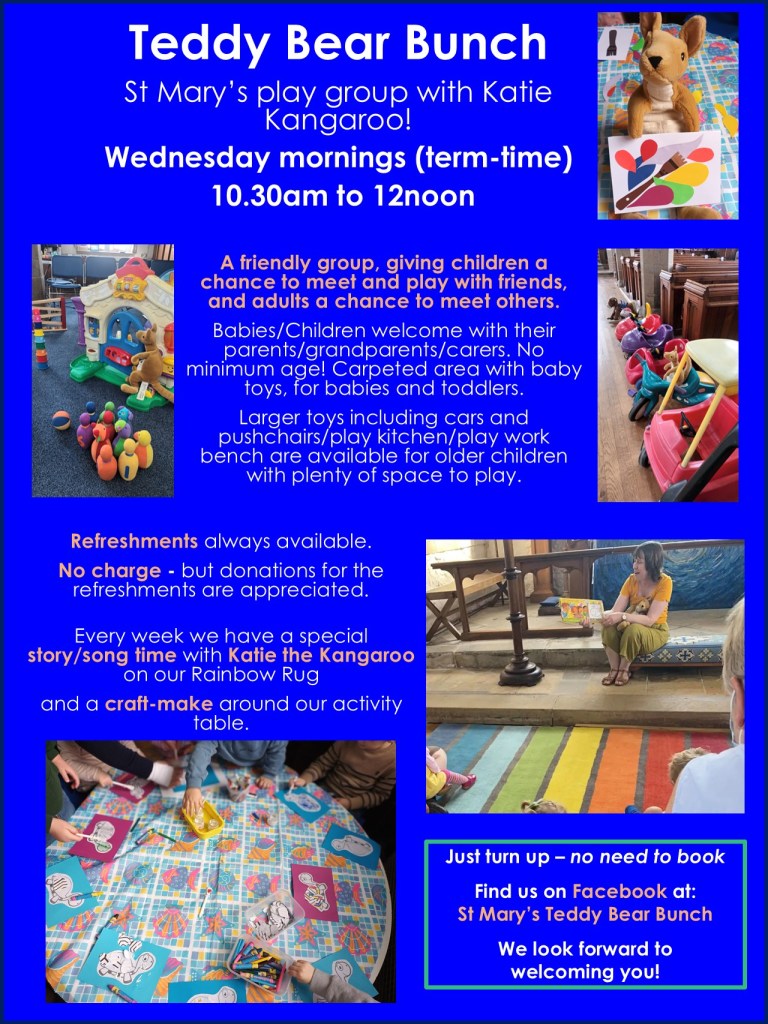 Welcome! Teddy Bear Bunch meets at St Marys, Broughton Astley from 10.30am to 12noon on Wednesday mornings during the school term. This is a friendly group for babies up to school-age where children can play (or watch if very young!) while Parents/Carers get a chance to have some grown-up company and a cuppa. We always have a story and song time with Katie Kangaroo and a craft. There is no charge, but donations are welcome.
